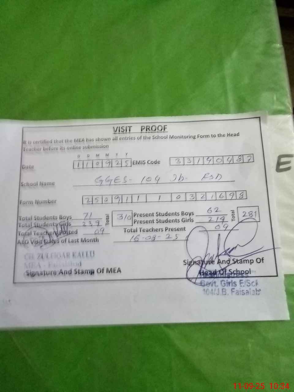 | Attendance Register | Head Teacher | MEA with School | Visit Proof |