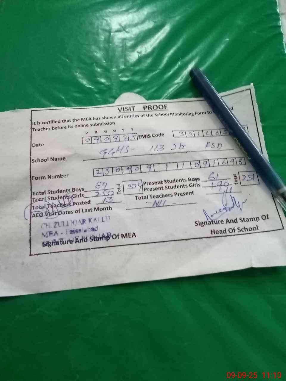 | Attendance Register | Head Teacher | MEA with School | Visit Proof |