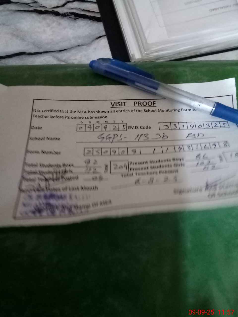 | Attendance Register | Head Teacher | MEA with School | Visit Proof |
