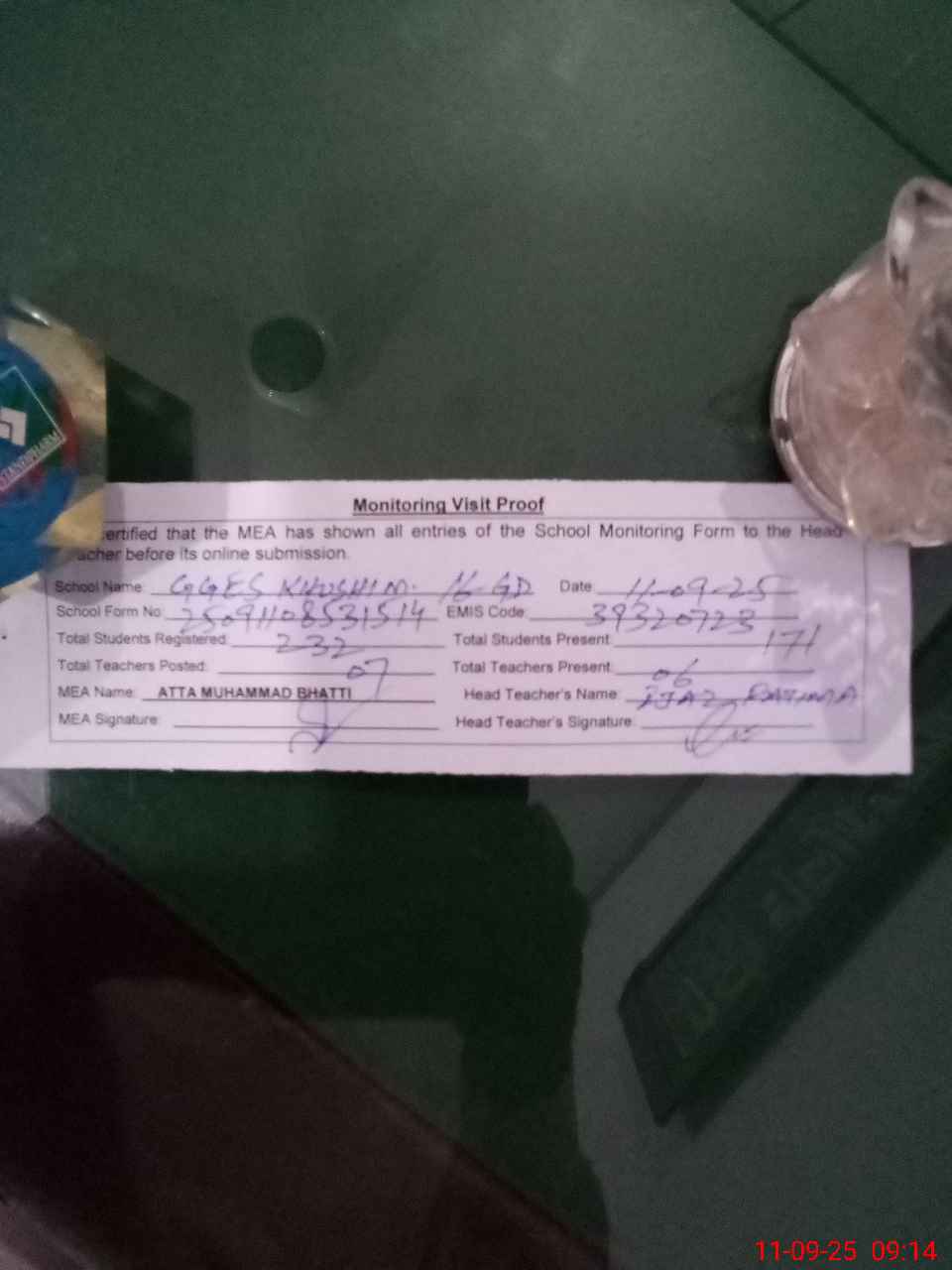 | Attendance Register | Head Teacher | MEA with School | Visit Proof |