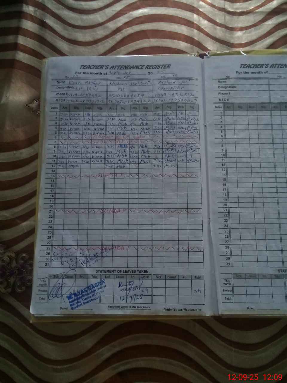 | CNIC | Full Name | Designation | R/C | Absence During Last Calender Month |