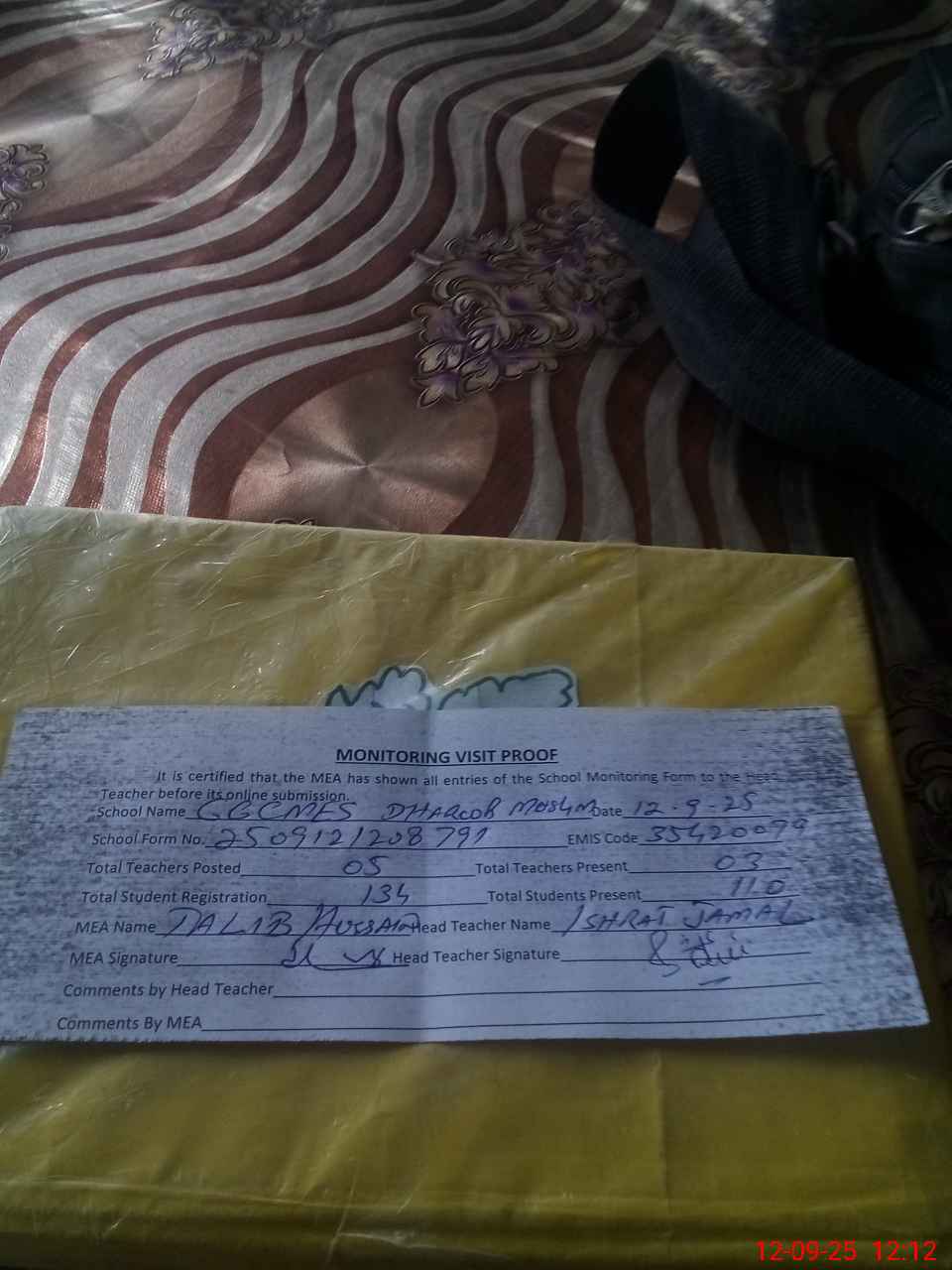 | Attendance Register | Head Teacher | MEA with School | Visit Proof |