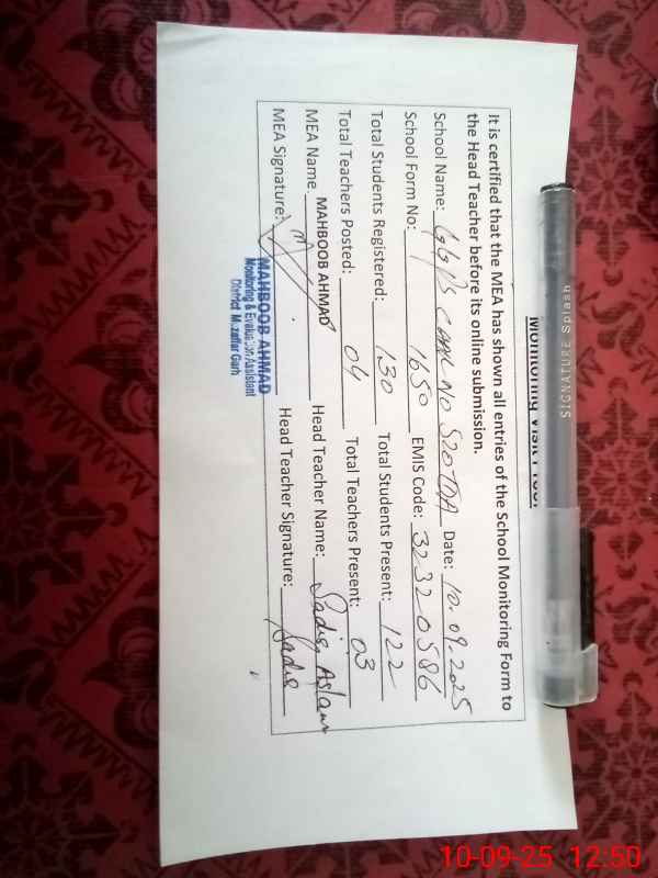 | Attendance Register | Head Teacher | MEA with School | Visit Proof |