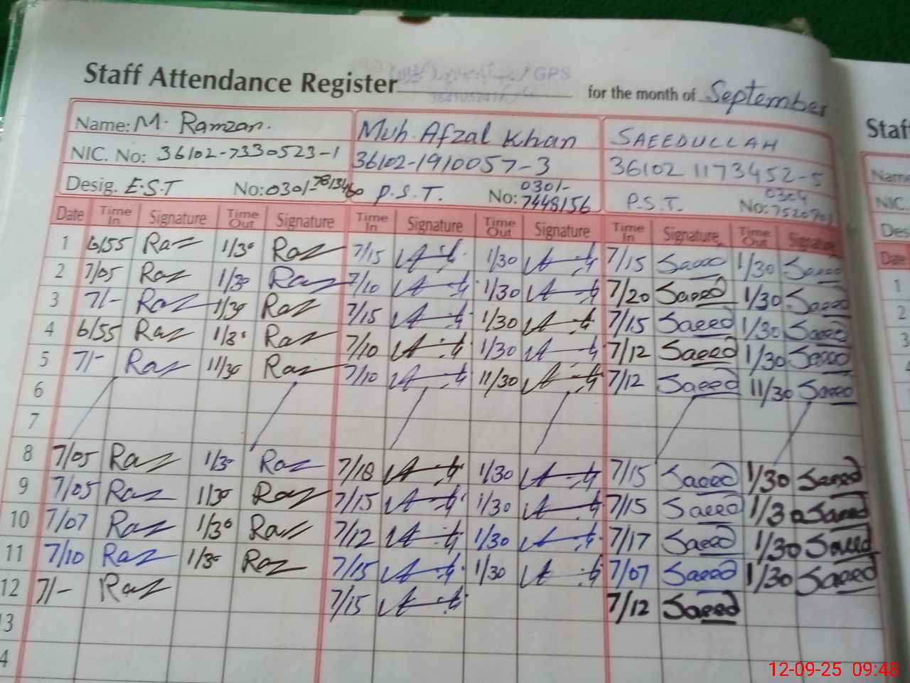| CNIC | Full Name | Designation | R/C | Absence during last cal. month |