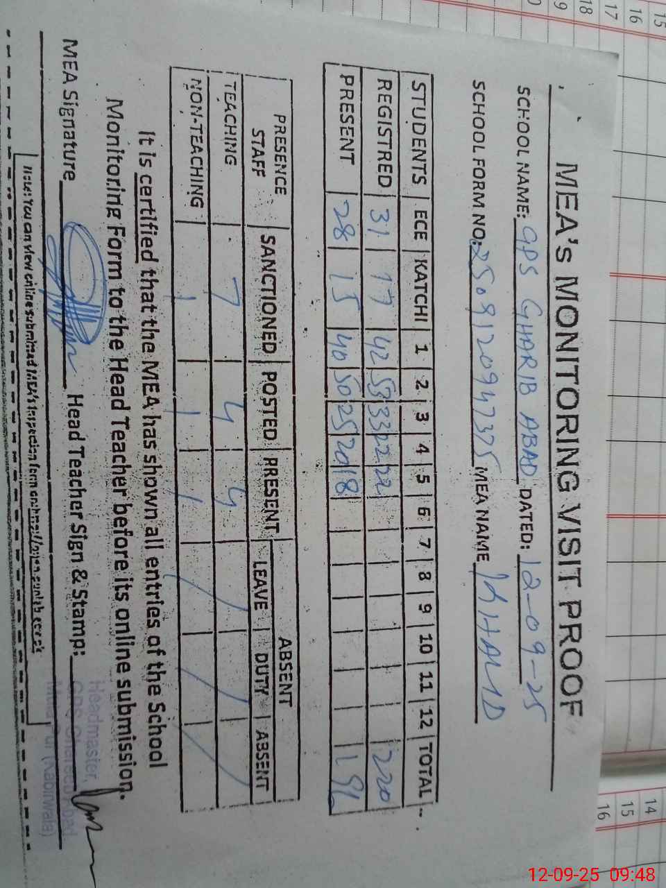 | Attendance Register | Head Teacher | MEA with School | Visit Proof |