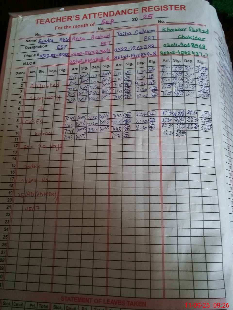 | Name: UL**** RI**** Designation: (School Headmaster's/Headmistress's) PST Phone/Cell Number: 03**** |