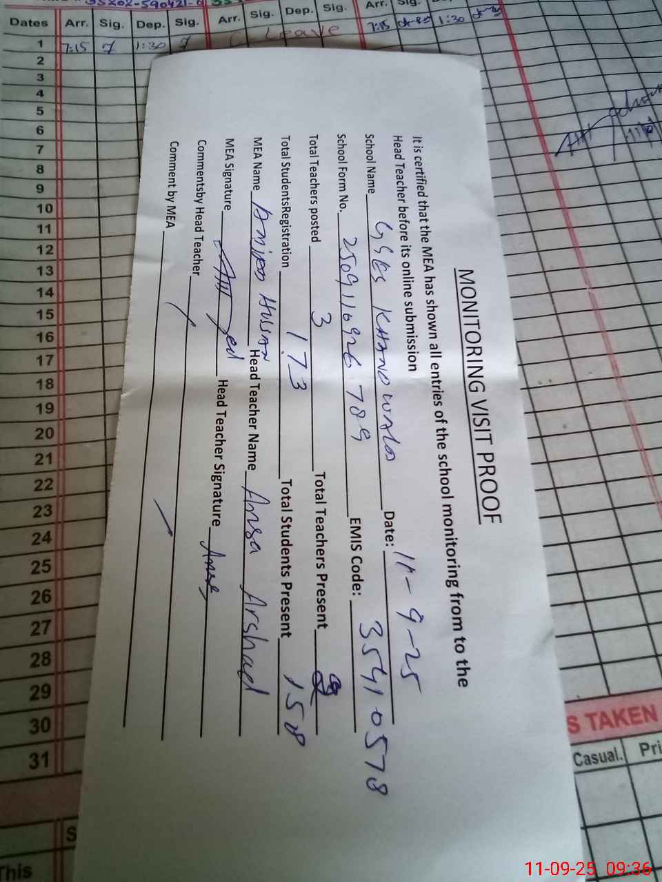 | Attendance Register | Head Teacher | MEA with School | Visit Proof |