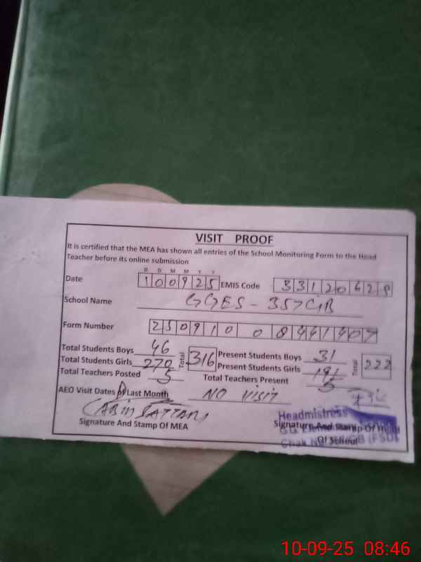 | Attendance Register | Head Teacher | MEA with School | Visit Proof |