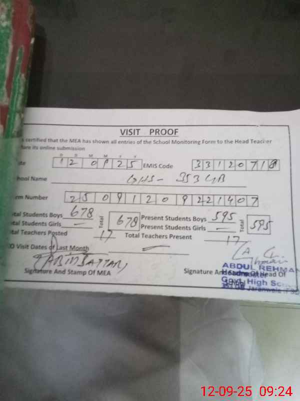| EMIS Code: 33120718 | Name of School: GHS CHAK NO 353 GB | |||