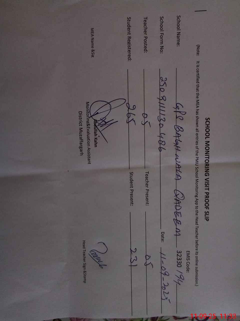 | Attendance Register | Head Teacher | MEA with School | Visit Proof |