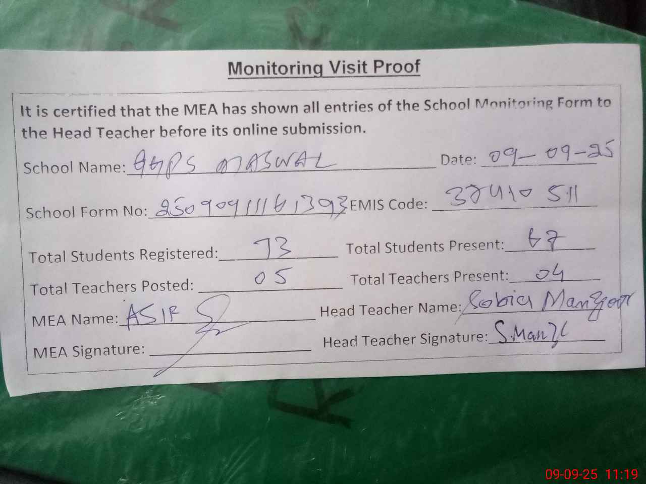 | EMIS Code: 37410511 | Name of School: GGPS MASWAL | |||