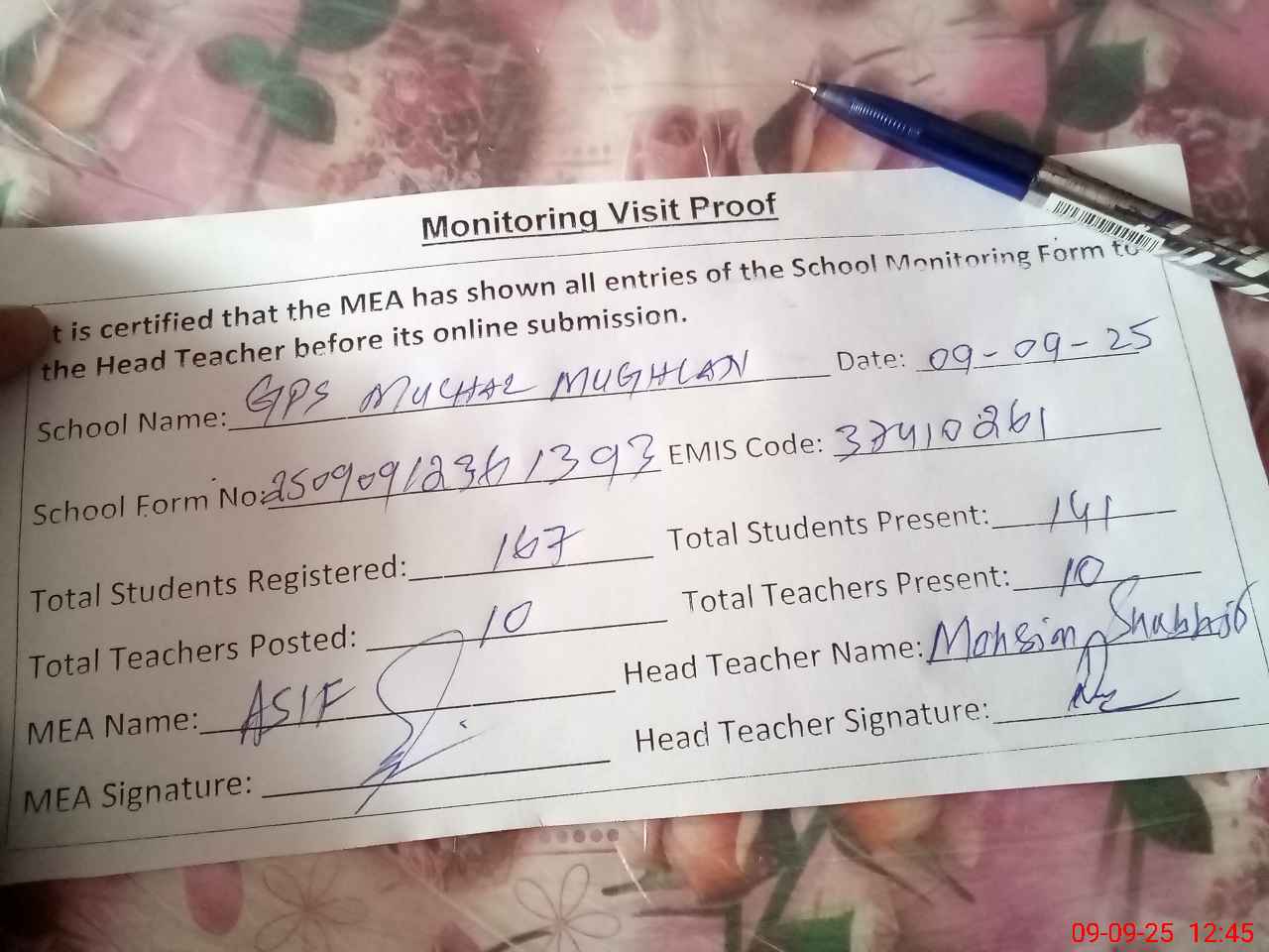 | Attendance Register | Head Teacher | MEA with School | Visit Proof |