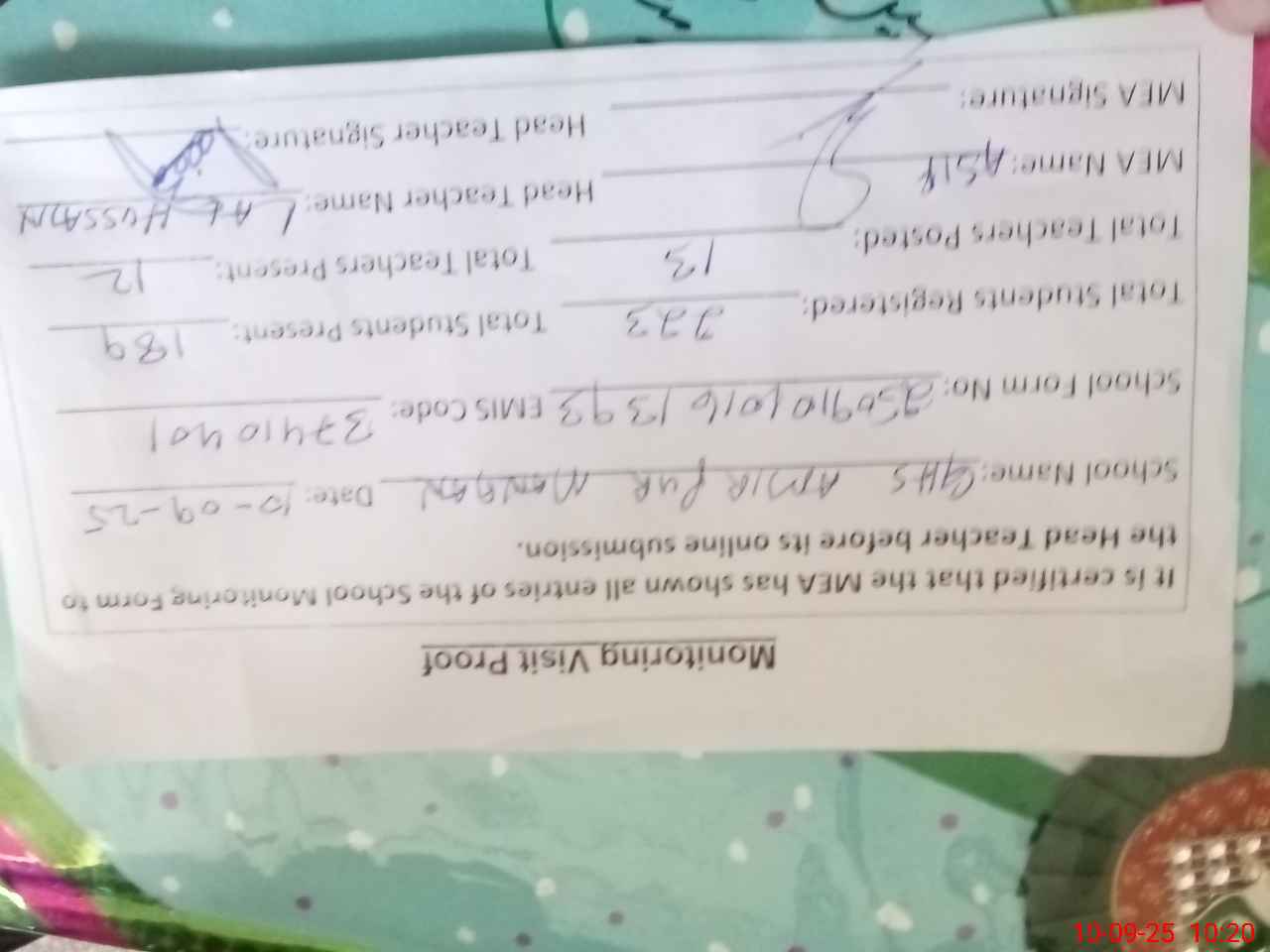 | Attendance Register | Head Teacher | MEA with School | Visit Proof |