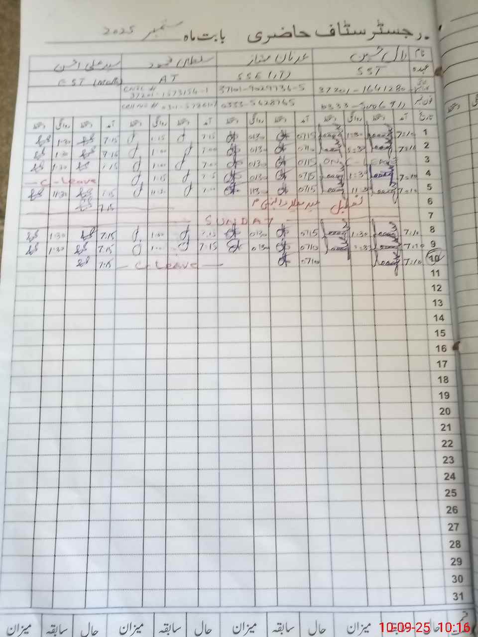 | CNIC | Full Name | Designation | R/C | Absence during last cal. month |