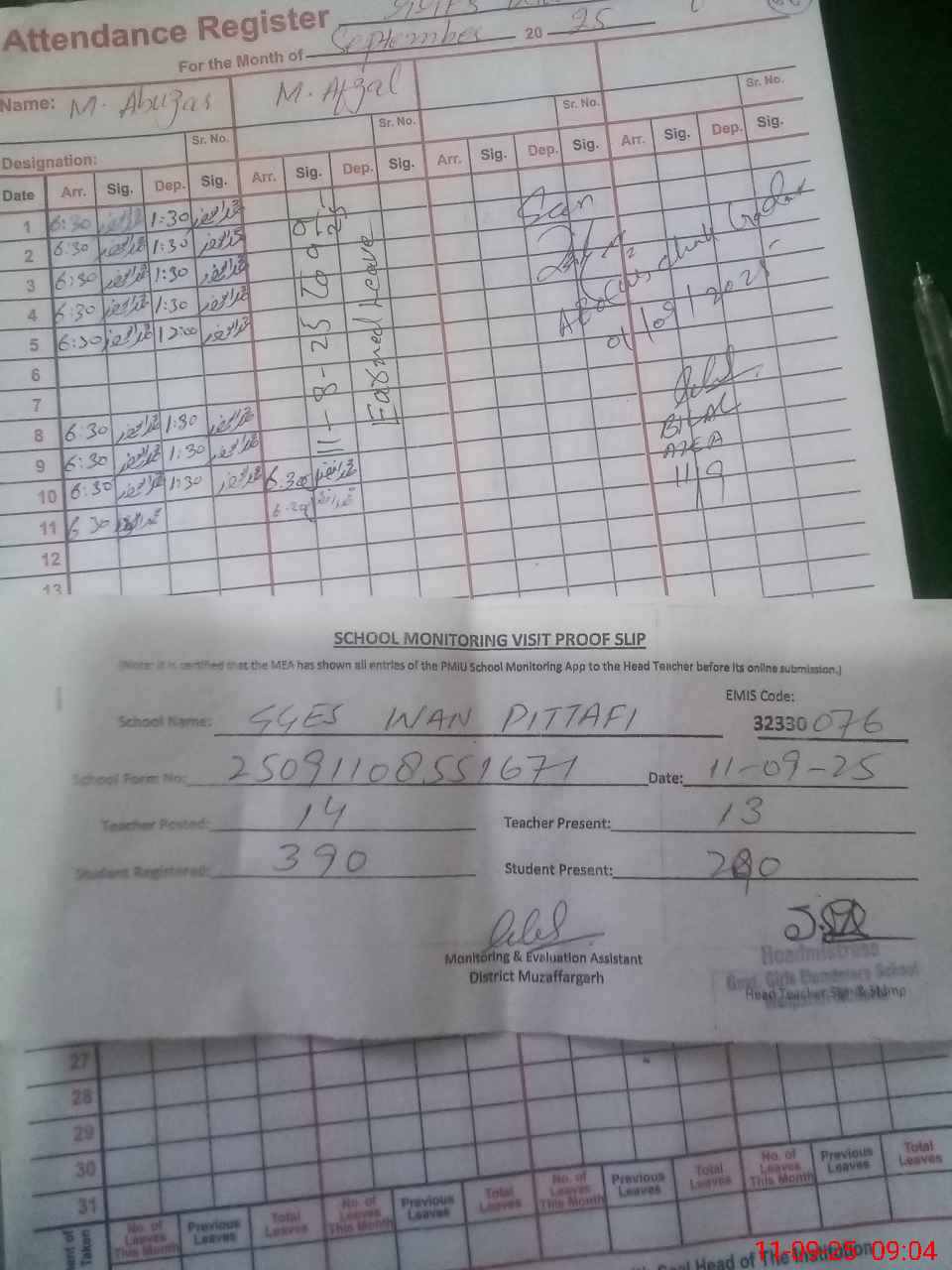 | Attendance Register | Head Teacher | MEA with School | Visit Proof |