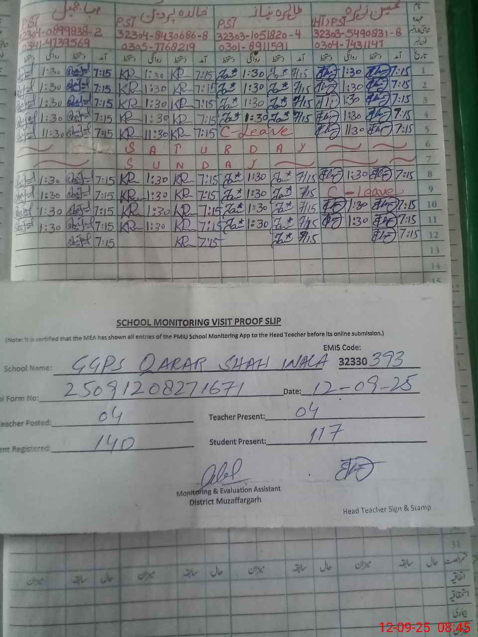 | Attendance Register | Head Teacher | MEA with School | Visit Proof |