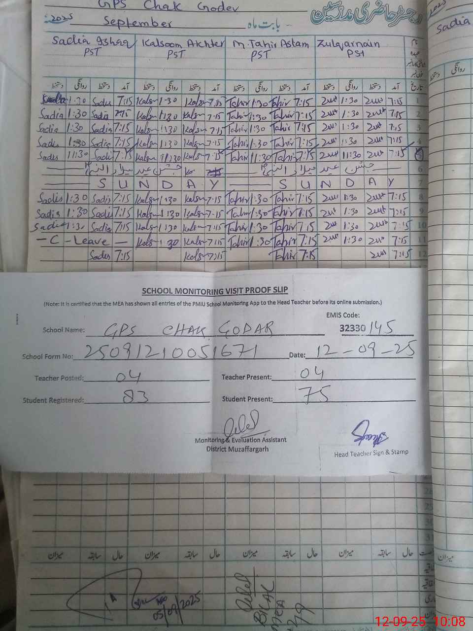 | Attendance Register | Head Teacher | MEA with School | Visit Proof |