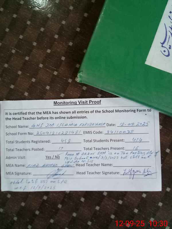| EMIS Code: 34110038 | Name of School: GHS JM ISLAMIA FEROZ WALA | |||