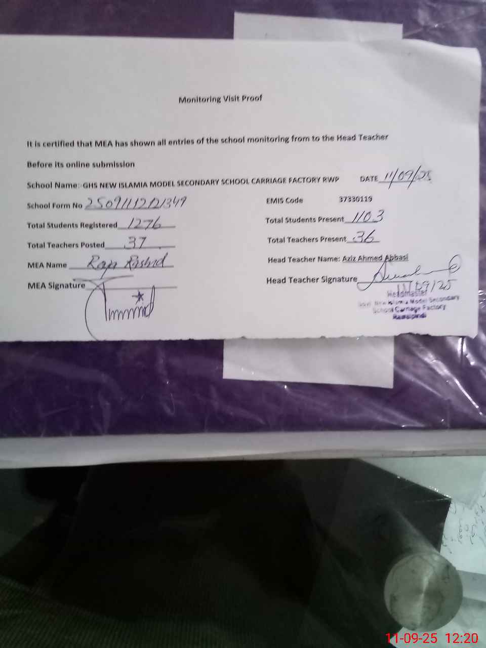 | Attendance Register | Head Teacher | MEA with School | Visit Proof |