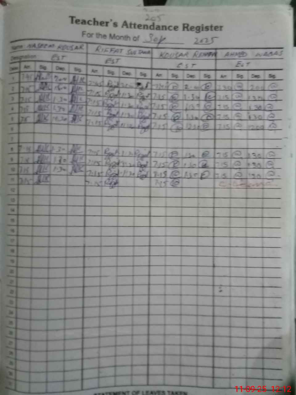 | Monitoring Date: 11-09-2025 | Start Time: 11-09-2025 11:22 AM | End Time: 11-09-2025 12:21 PM | Name of MEA: Ra**** Ra**** Al**** | |