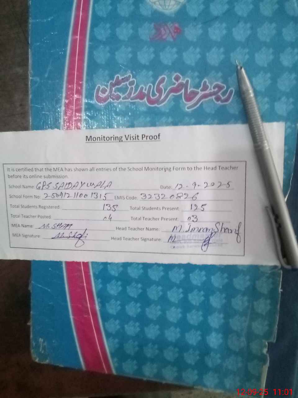| Attendance Register | Head Teacher | MEA with School | Visit Proof |