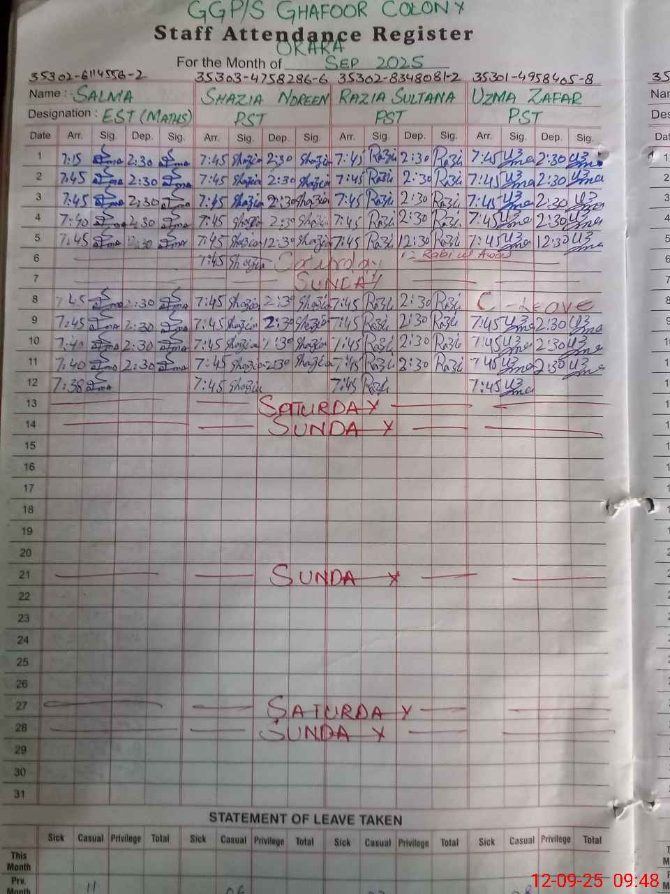 | CNIC | Full Name | Designation | R/C | Absence During Last Calender Month |