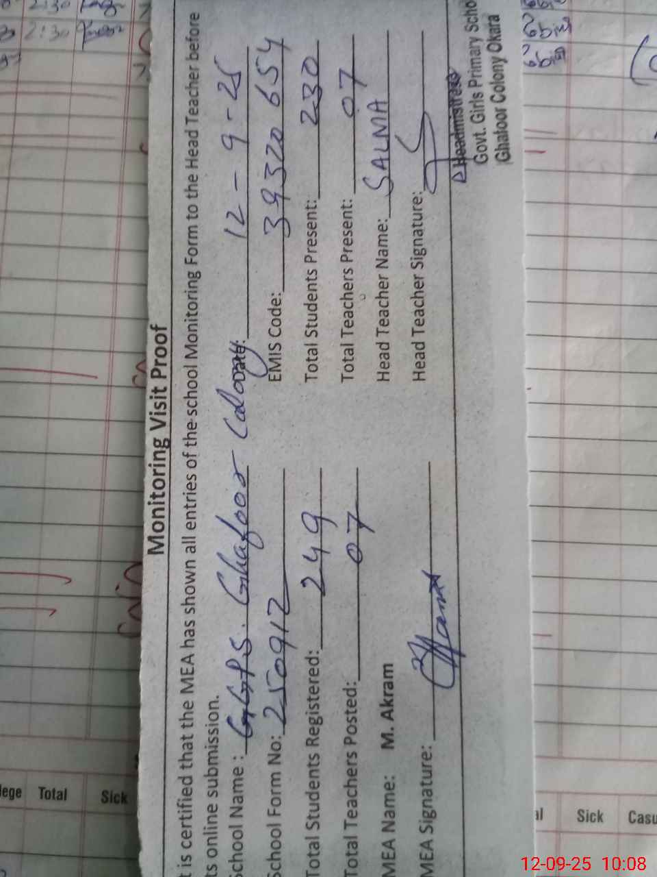 | Attendance Register | Head Teacher | MEA with School | Visit Proof |