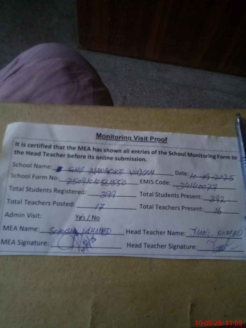 | Attendance Register | Head Teacher | MEA with School | Visit Proof |