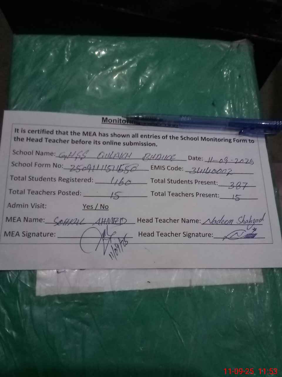 | Monitoring Date: 11-09-2025 | Start Time: 11-09-2025 11:02 AM | End Time: 11-09-2025 11:54 AM | Name of MEA: N-**** Ah**** | |