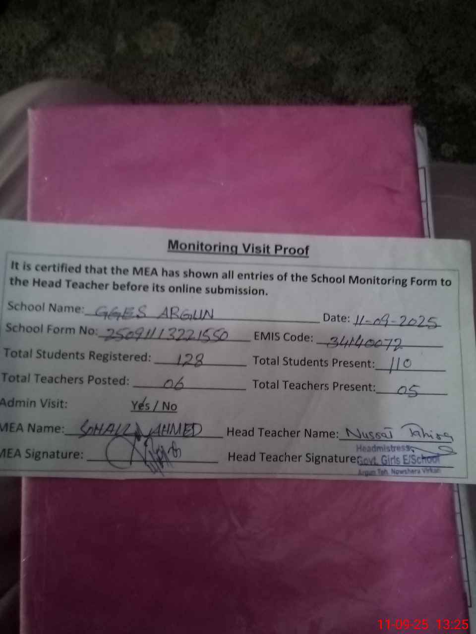 | Attendance Register | Head Teacher | MEA with School | Visit Proof |