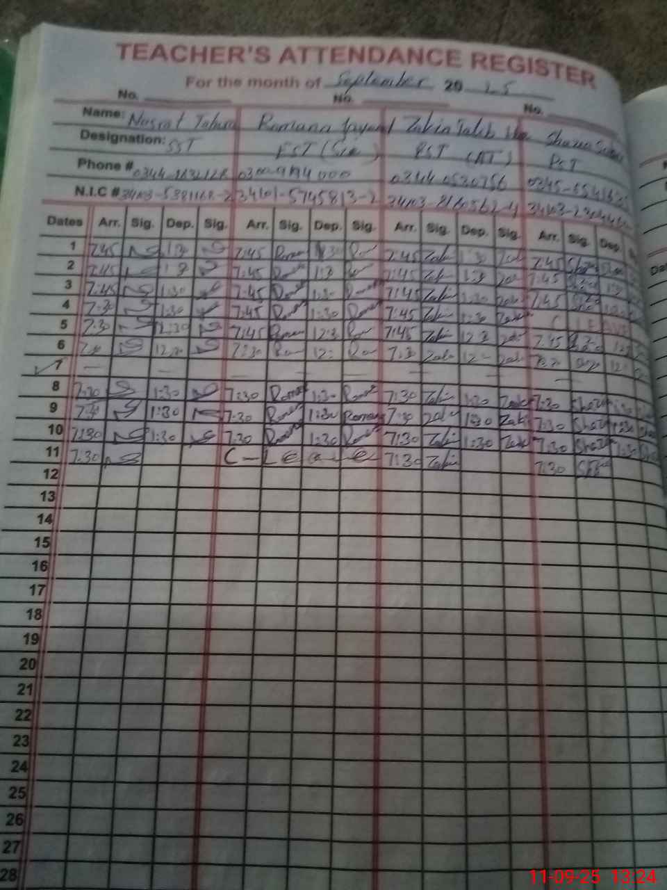 | CNIC | Full Name | Designation | R/C | Absence during last cal. month |