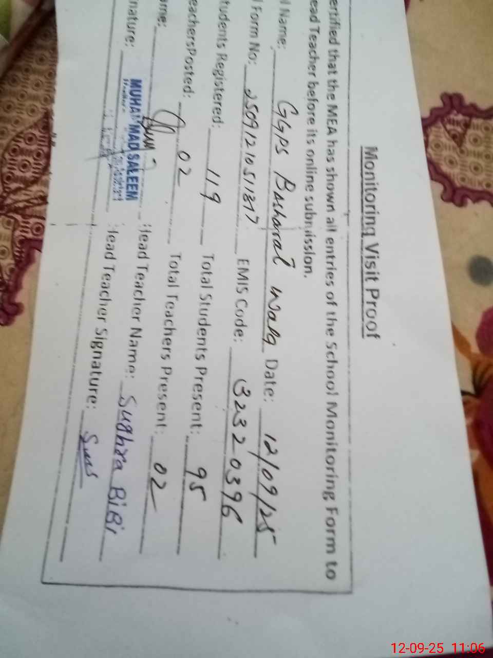 | Attendance Register | Head Teacher | MEA with School | Visit Proof |