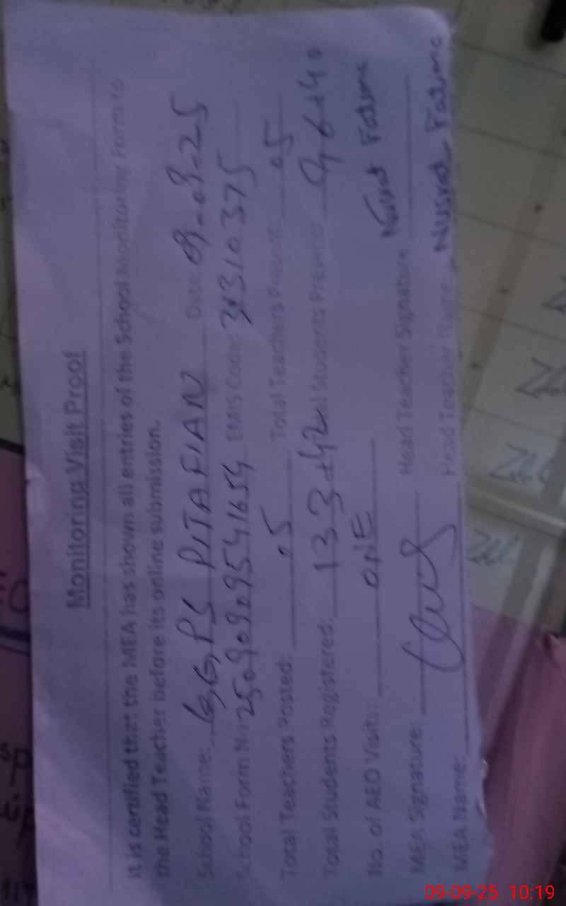 | Attendance Register | Head Teacher | MEA with School | Visit Proof |