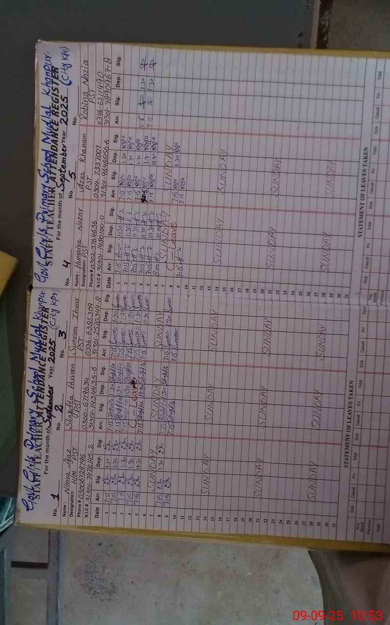 | CNIC | Full Name | Designation | R/C | Absence During Last Calender Month |