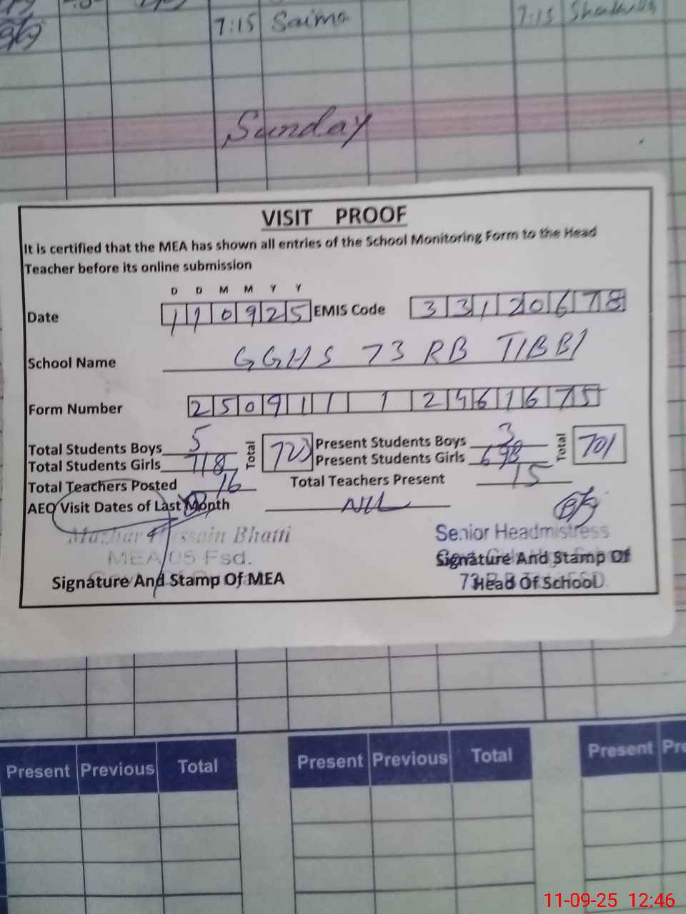 | Attendance Register | Head Teacher | MEA with School | Visit Proof |