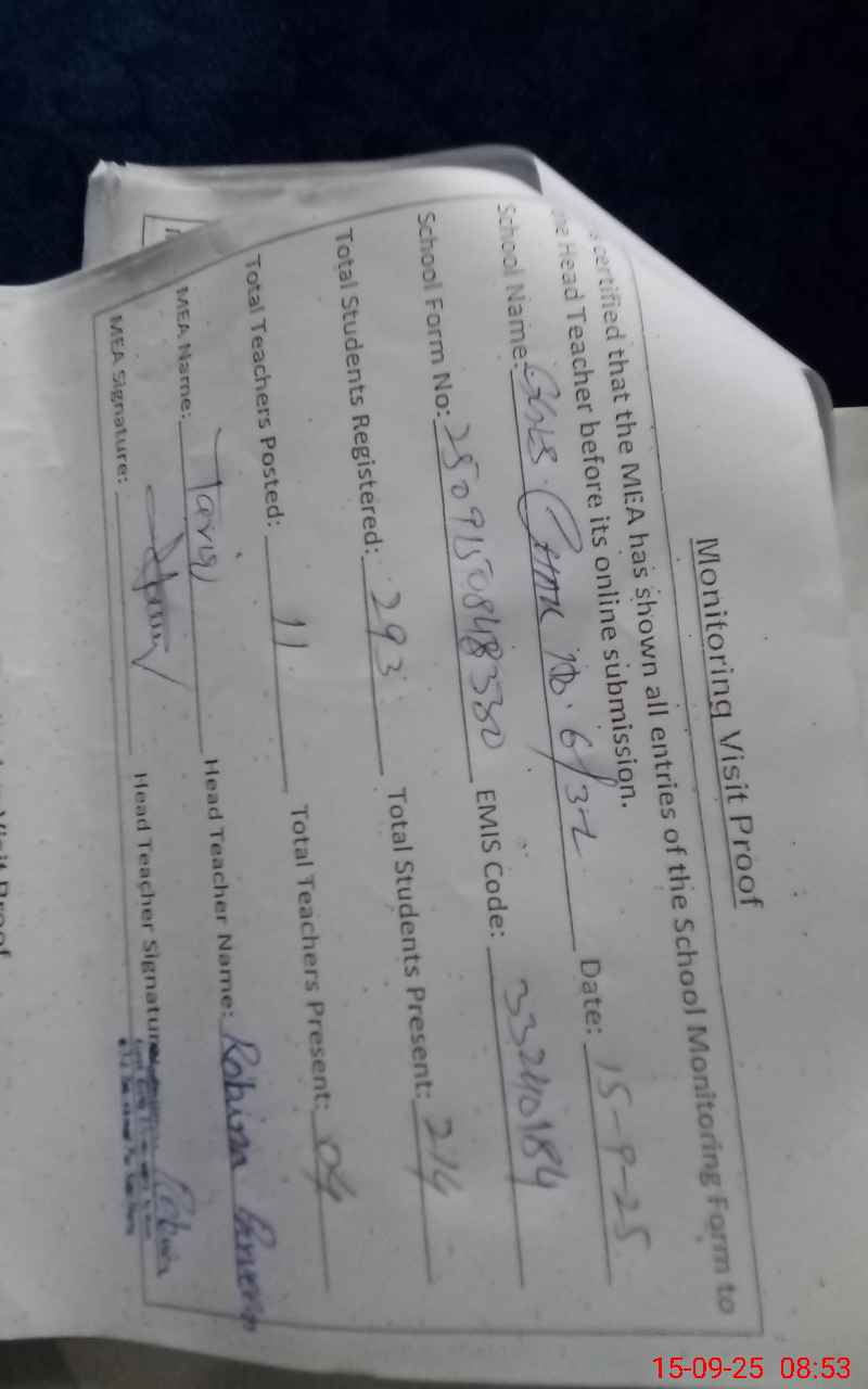 | Attendance Register | Head Teacher | MEA with School | Visit Proof |