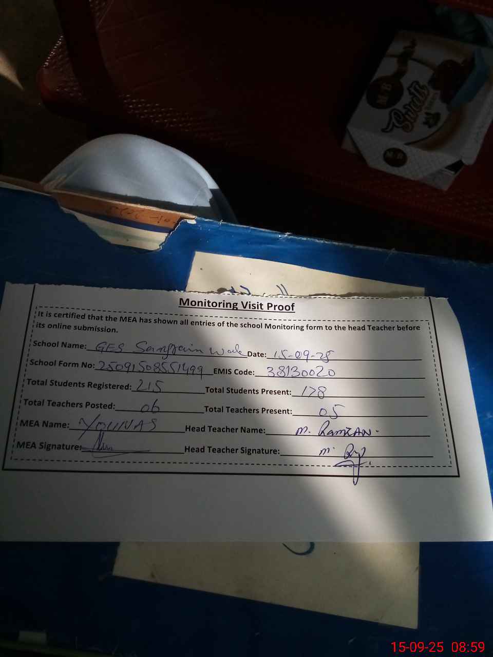 | Attendance Register | Head Teacher | MEA with School | Visit Proof |