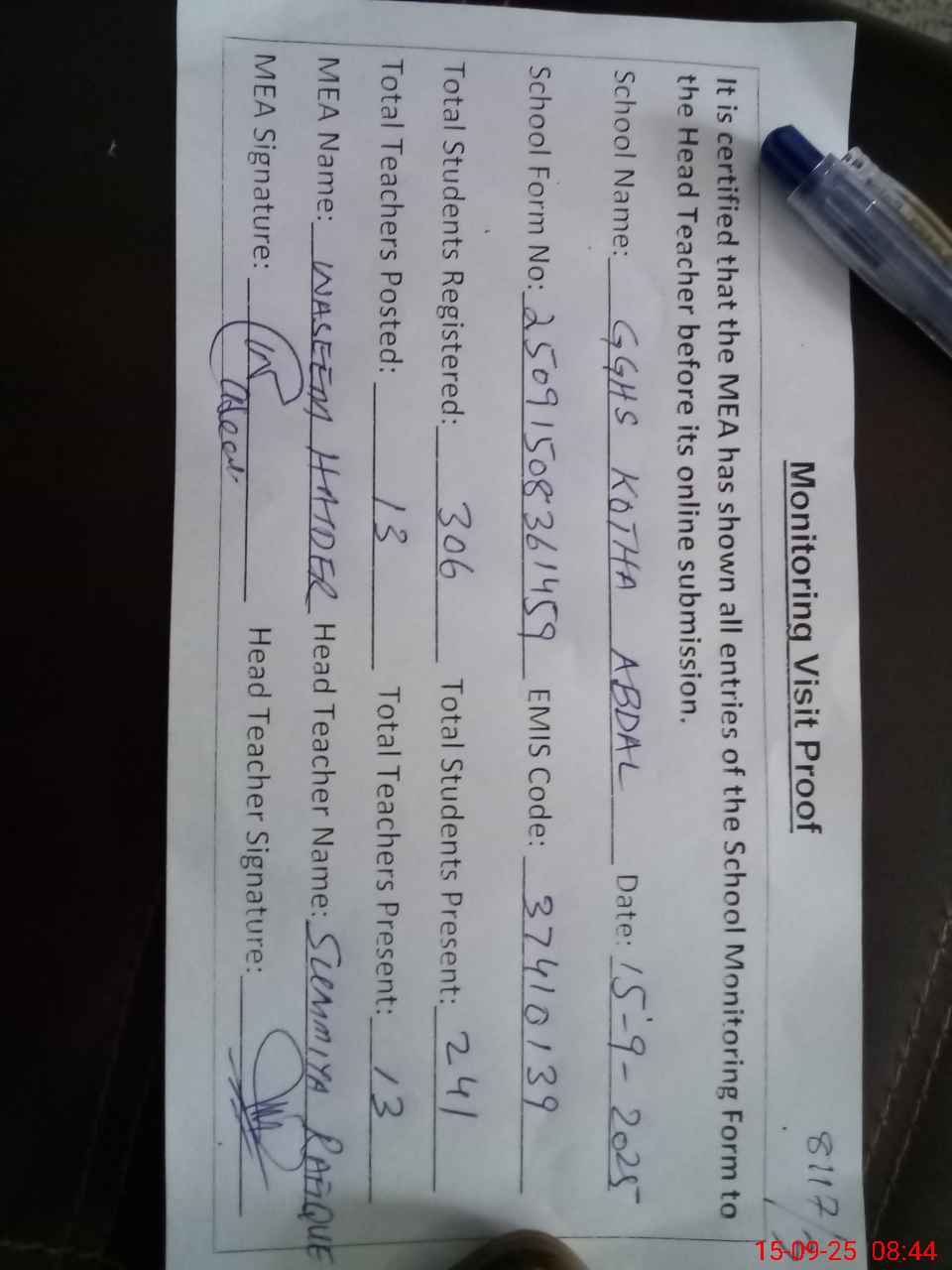 | Certified that this School was Inspected by the Undersigned MEA/DMO Today and the Information Stated Above is as Per Record. | |||||