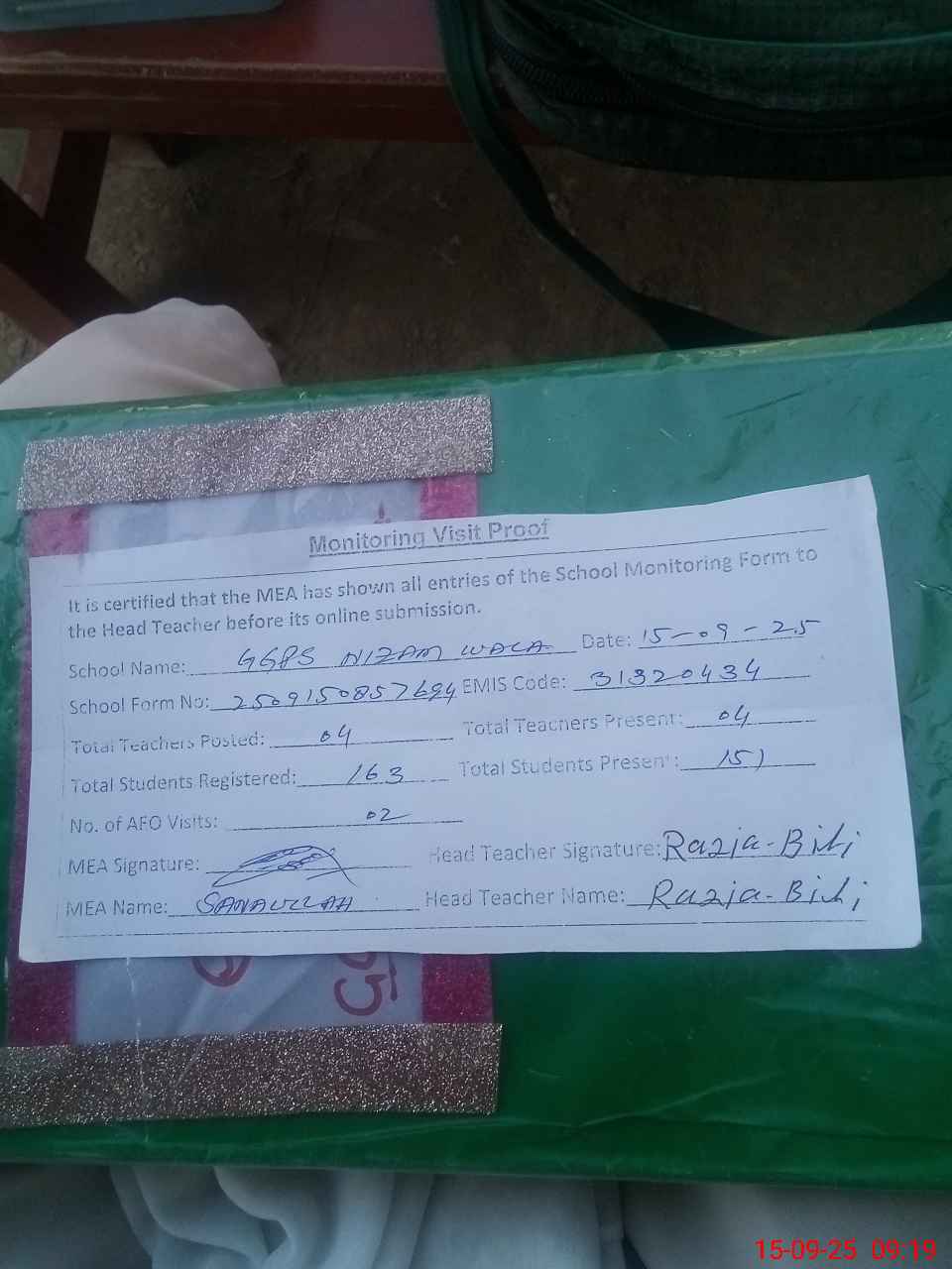 | Attendance Register | Head Teacher | MEA with School | Visit Proof |