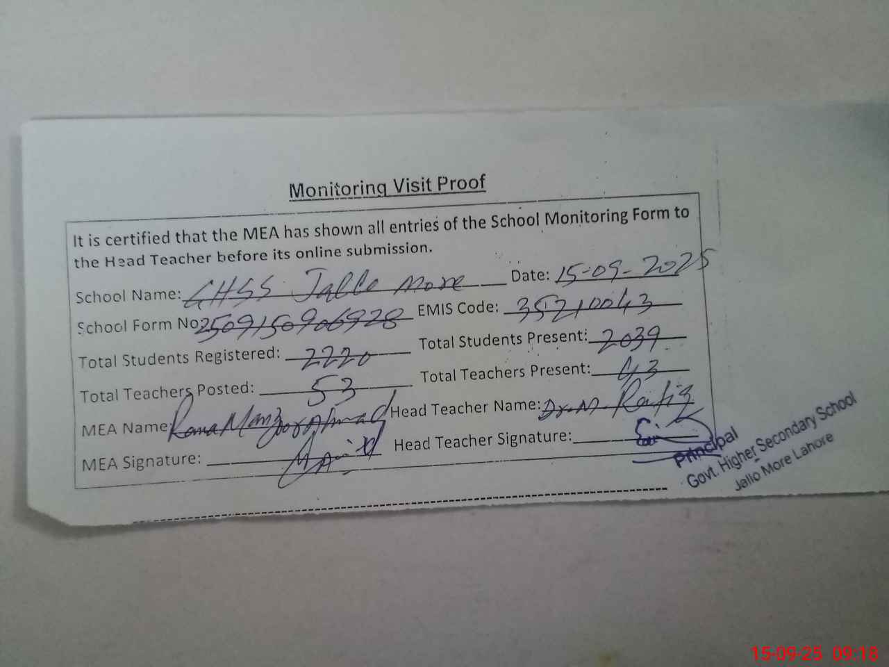 | Certified that this School was Inspected by the Undersigned MEA/DMO Today and the Information Stated Above is as Per Record. | |||||