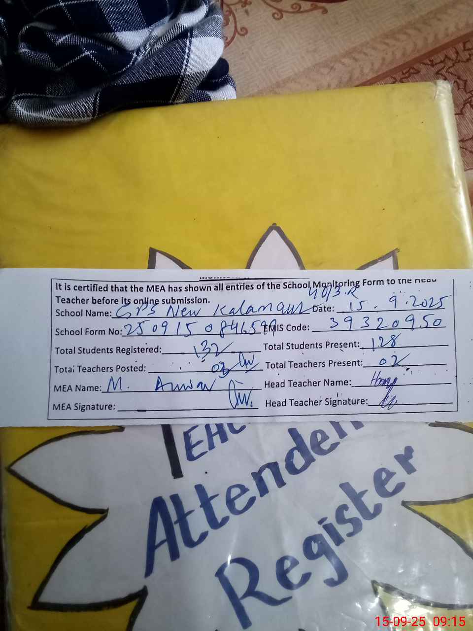 | Attendance Register | Head Teacher | MEA with School | Visit Proof |