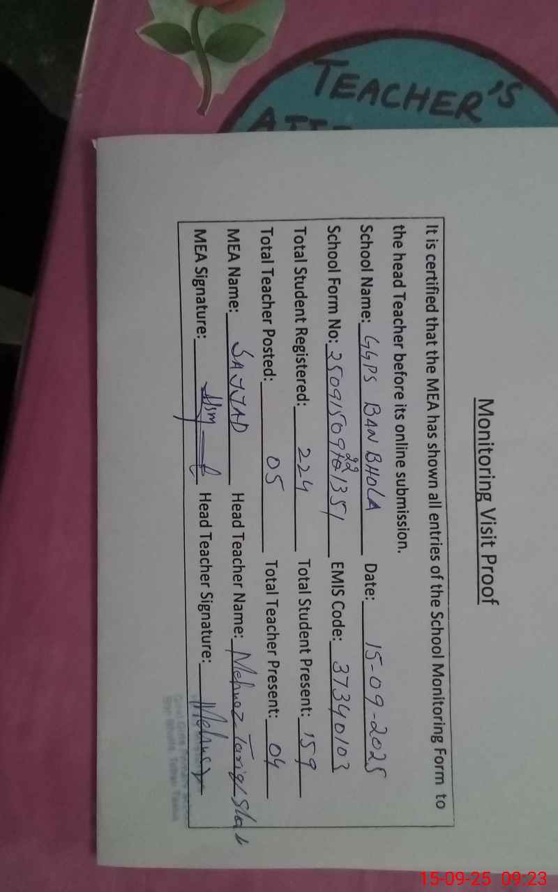 | EMIS Code: 37340103 | Name of School: GGPS BAN BHOLA | |||