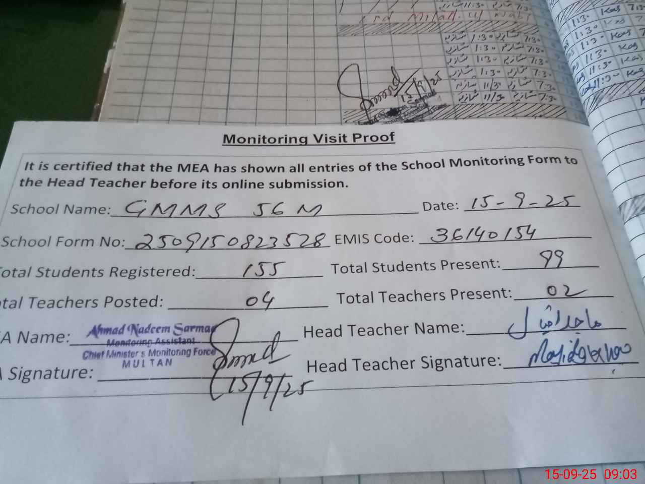 | EMIS Code: 36140154 | Name of School: Govt. Model Middle School Chak No. 56/M | |||