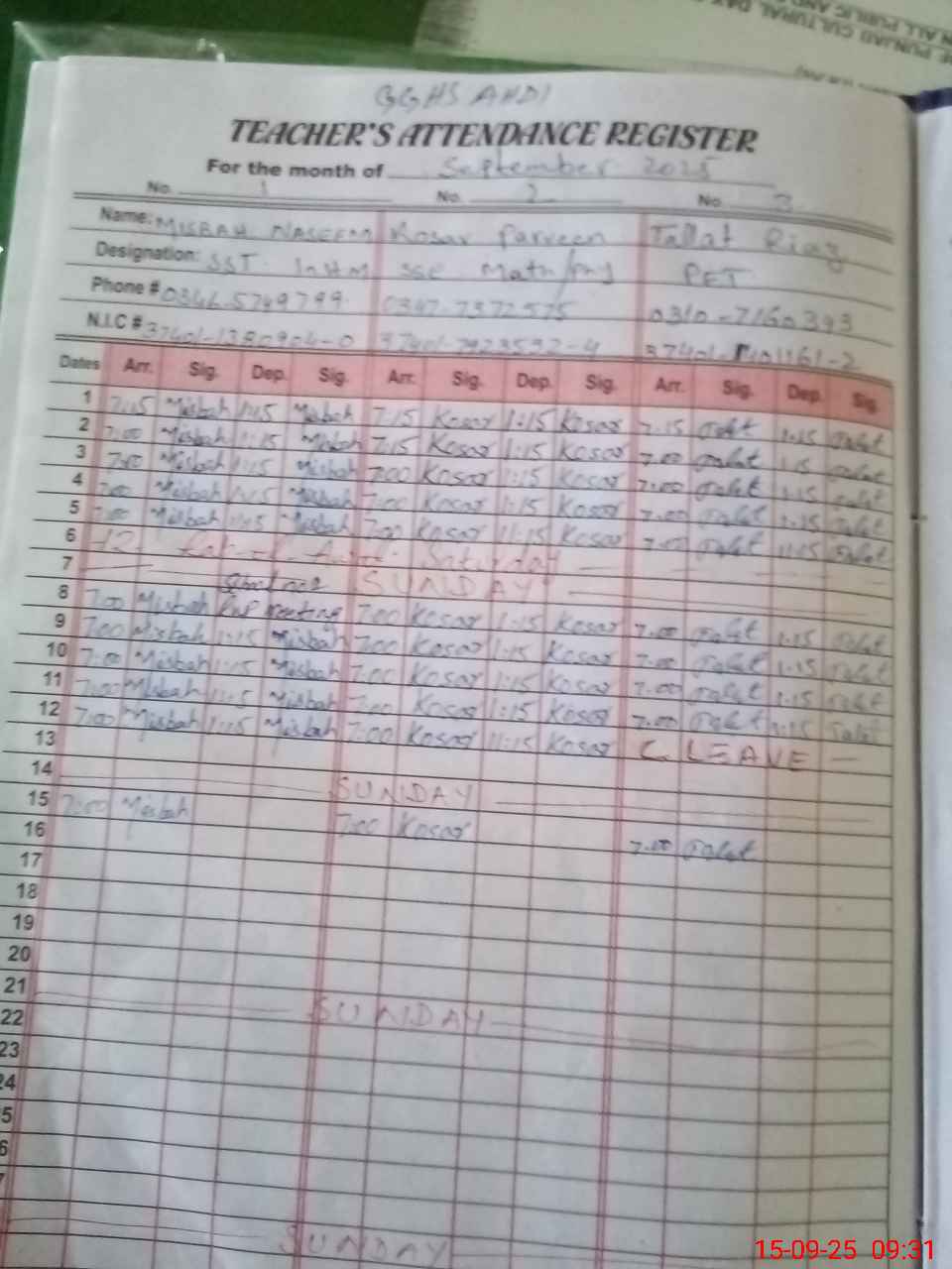 | CNIC | Full Name | Designation | R/C | Absence During Last Calender Month |