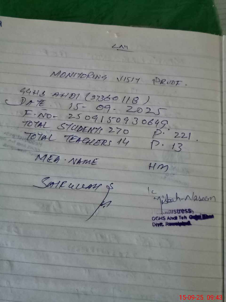 | Certified that this School was Inspected by the Undersigned MEA/DMO Today and the Information Stated Above is as Per Record. | |||||