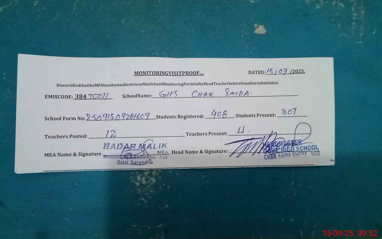 | EMIS Code: 38470071 | Name of School: GHS CHAK SAIDA | |||