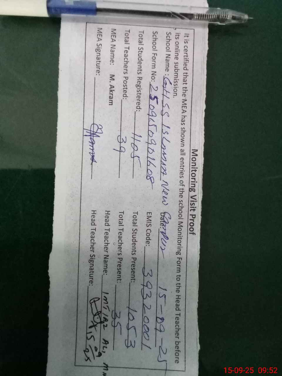 | EMIS Code: 39320001 | Name of School: GHSS ISLAMIA NEW CAMPUS | |||