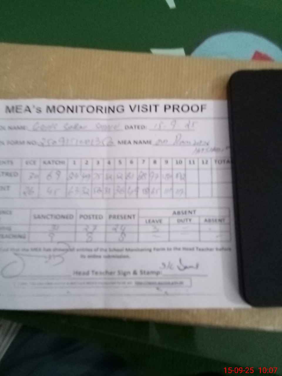 | Attendance Register | Head Teacher | MEA with School | Visit Proof |