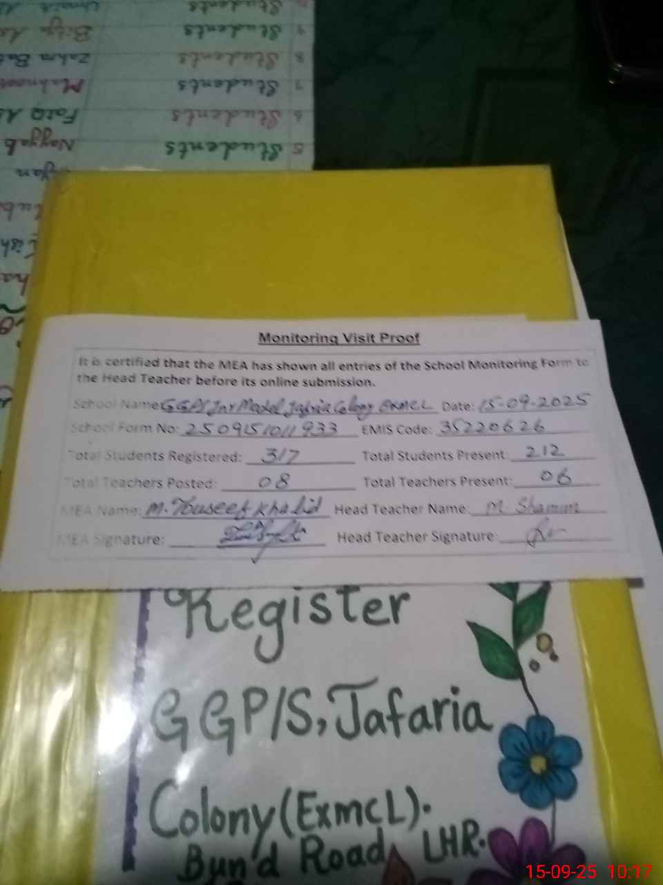 | EMIS Code: 35220626 | Name of School: GGPS JUNIOR MODEL JAFRIA COLONY BUND ROAD (EX-MCL) | |||