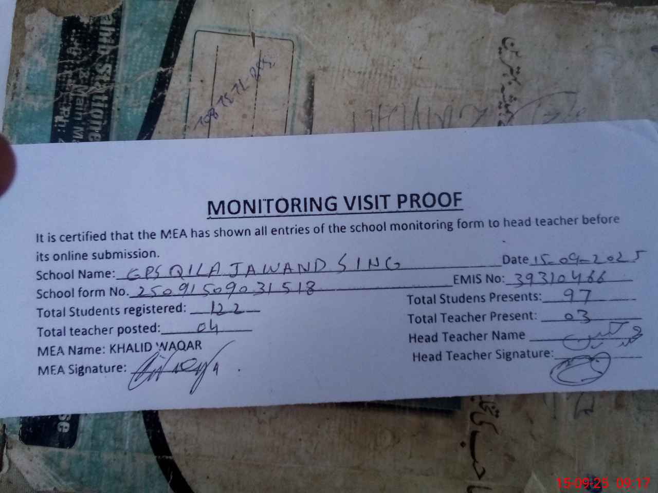 | Attendance Register | Head Teacher | MEA with School | Visit Proof |